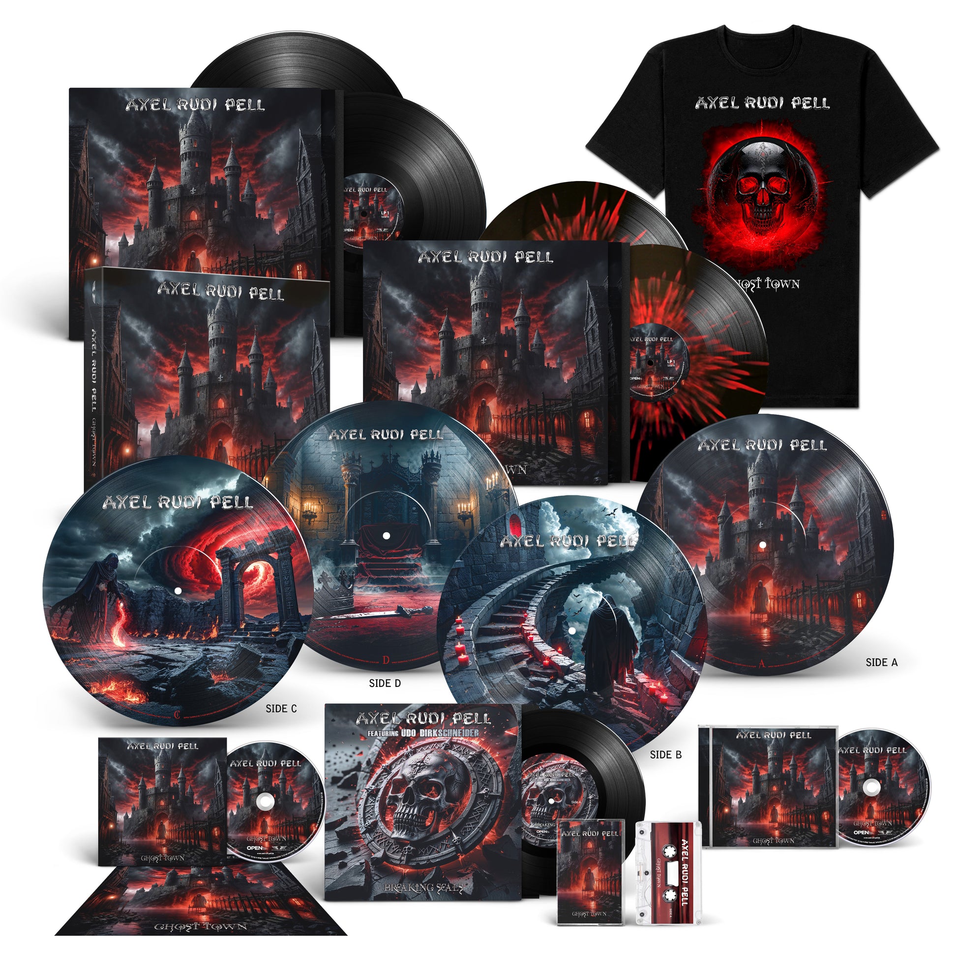 The bundle comes with the Axel Rudi Pell "Ghost Town" Box, exclusive 2LP (splatter black & rusty red vinyl), 2LP (black), CD (jewel case) and the exclusive "Skull" Shirt (S, M, L, XL, or XXL).