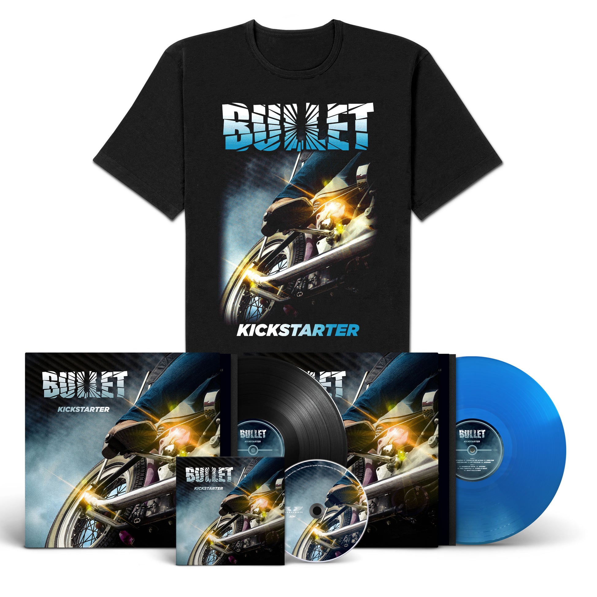 The bundle comes with the Bullet "Kickstarter" CD, LP (black), exclusive LP (translucent blue), and the exclusive "Kickstart" Shirt (S, M, L, XL, or XXL).