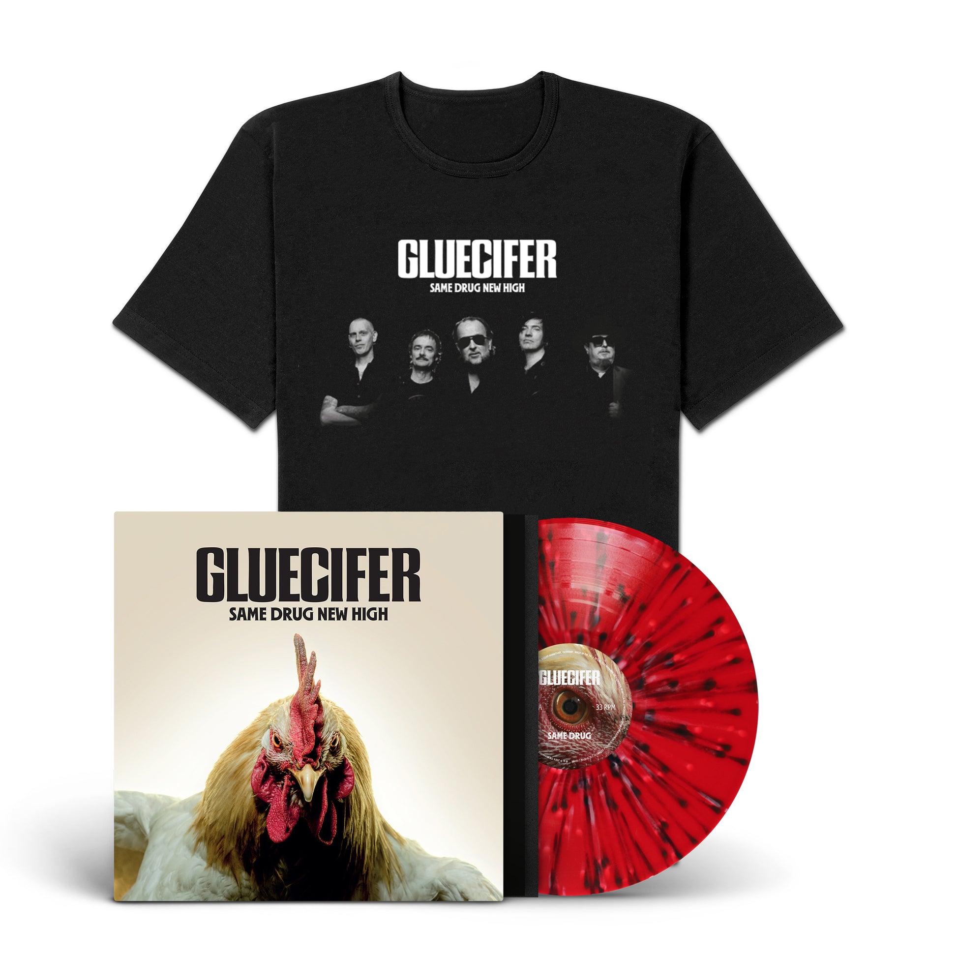 The bundle comes with the Gluecifer "Same Drug New High" exclusive LP (splatter red black white) and the exclusive "Band" Shirt (S, M, L, XL, or XXL).
