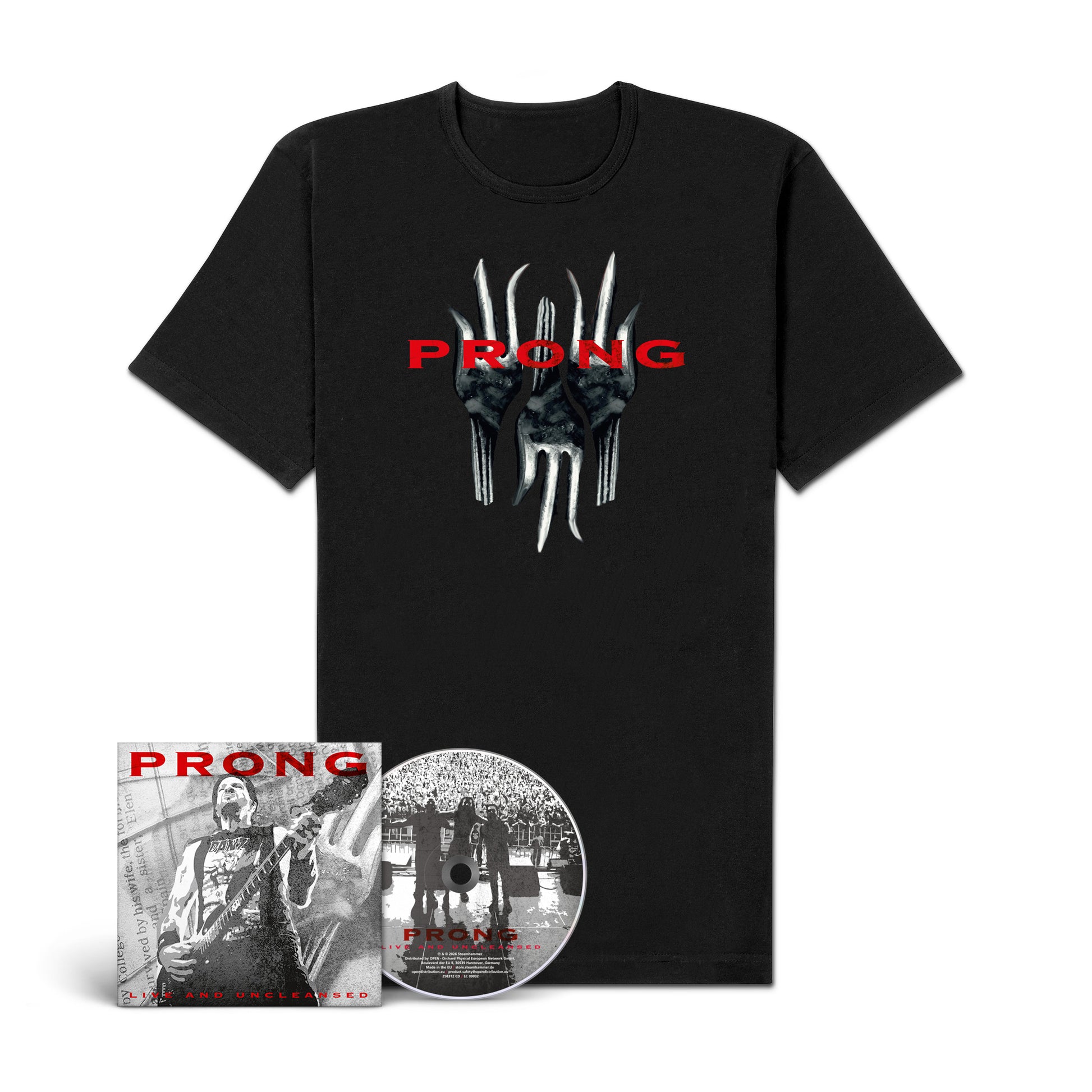 The bundle comes with the Prong "Live And Uncleansed" CD and the exclusive "Fork" Shirt (S, M, L, XL, or XXL).