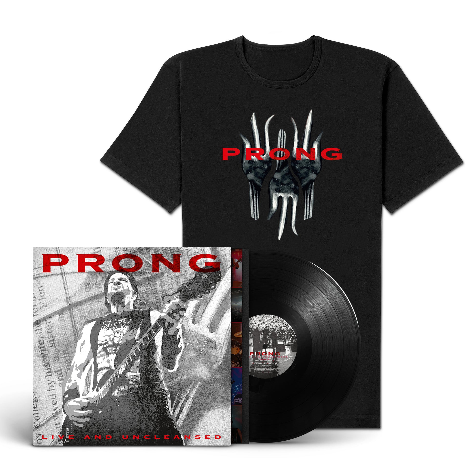 The bundle comes with the Prong "Live And Uncleansed" LP and the exclusive "Fork" Shirt (S, M, L, XL, or XXL).