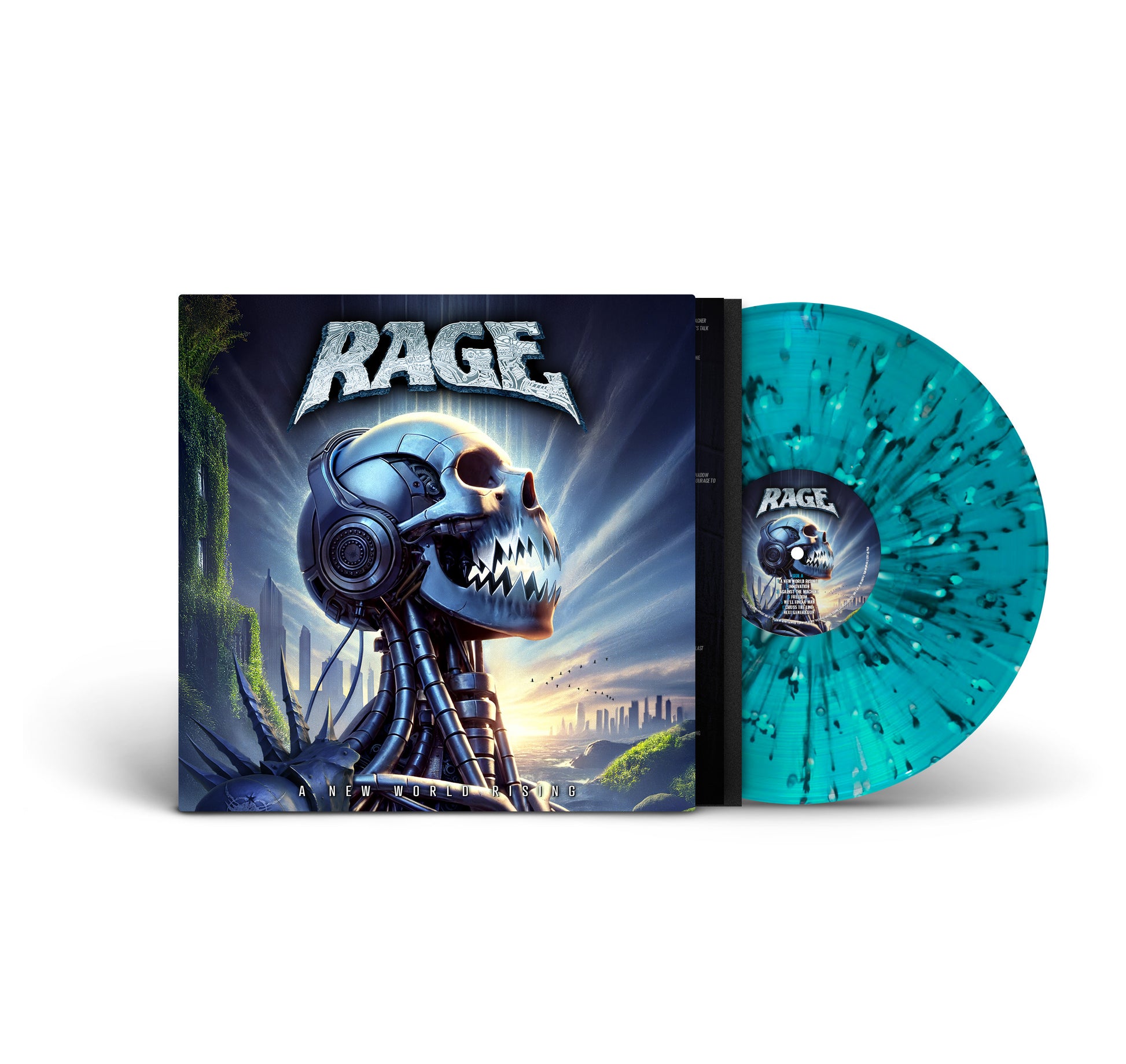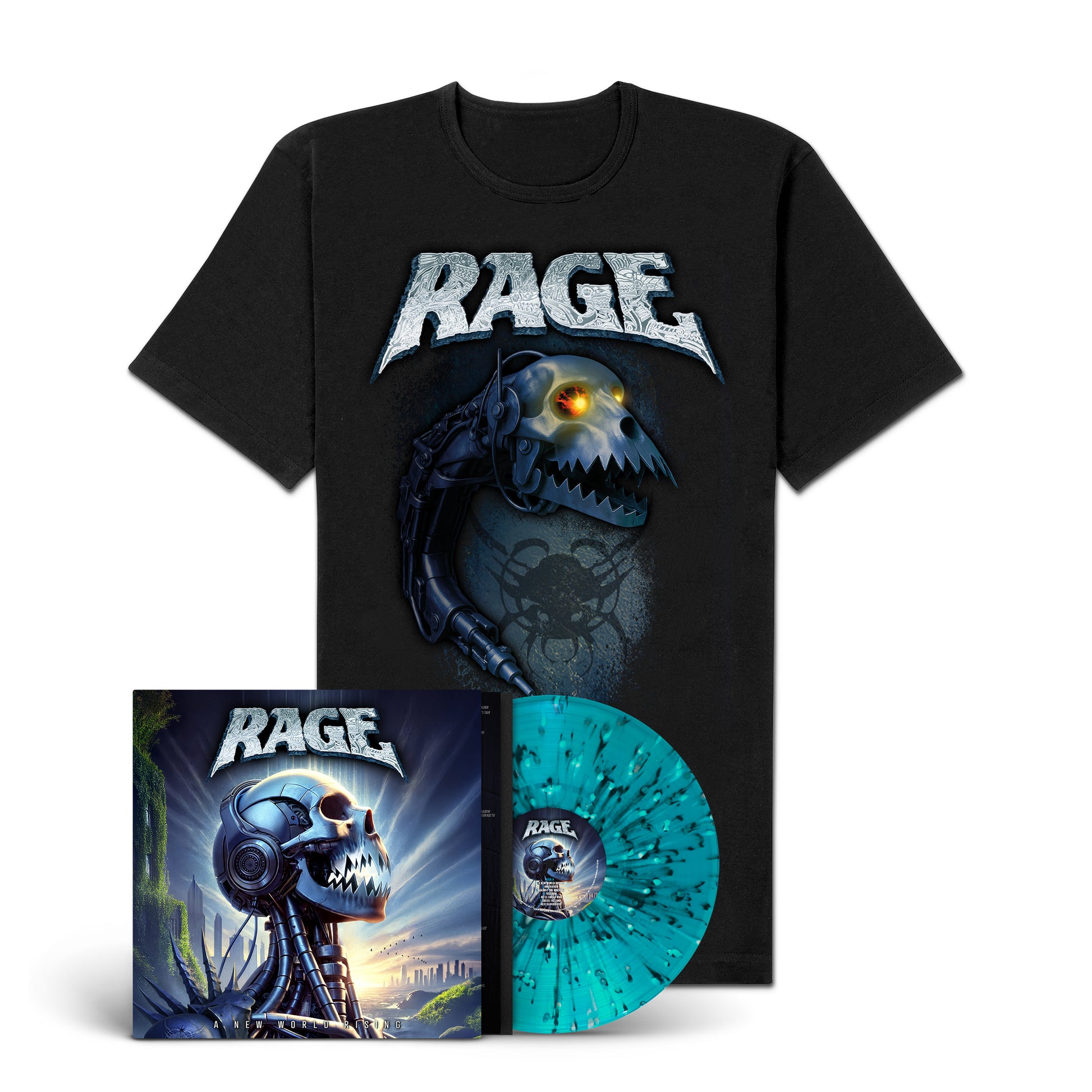 The bundle comes with the Rage "A New World Rising" exclusice LP and the exclusive "Rising" Shirt (S, M, L, XL, or XXL).