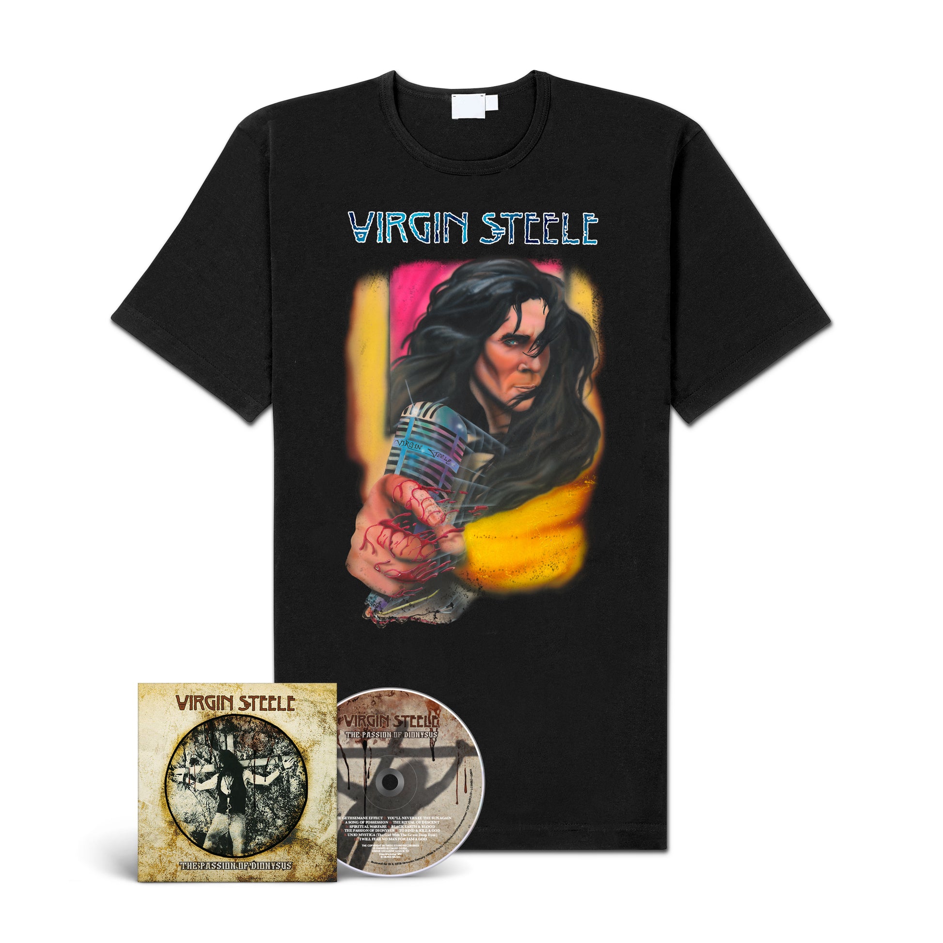The bundle comes with the Virgin Steele "The Passion Of Dionysus" CD and the "David DeFeis" Shirt (S, M, L, XL, or XXL).